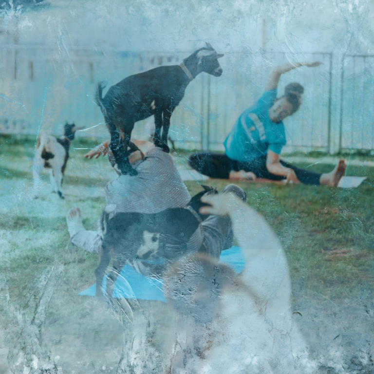 Stretch into a state of absurdity where our goats are less interested in your chakras and more committed to perfecting their “downward goat” on your spine while discreetly raiding your snack pockets.