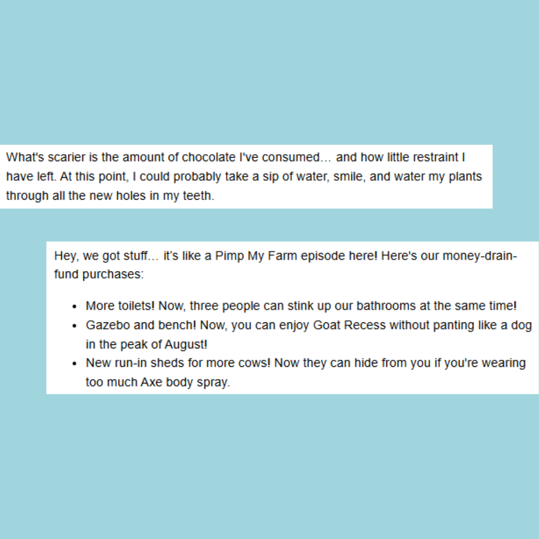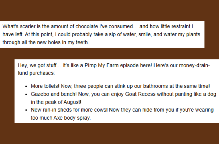 Be the first to know about special promotions, new experiences, farm & animal updates, and just ridiculous content that’ll make you gasp, ooh, aw, and woah! See below for a sneak peak at our newsletters!